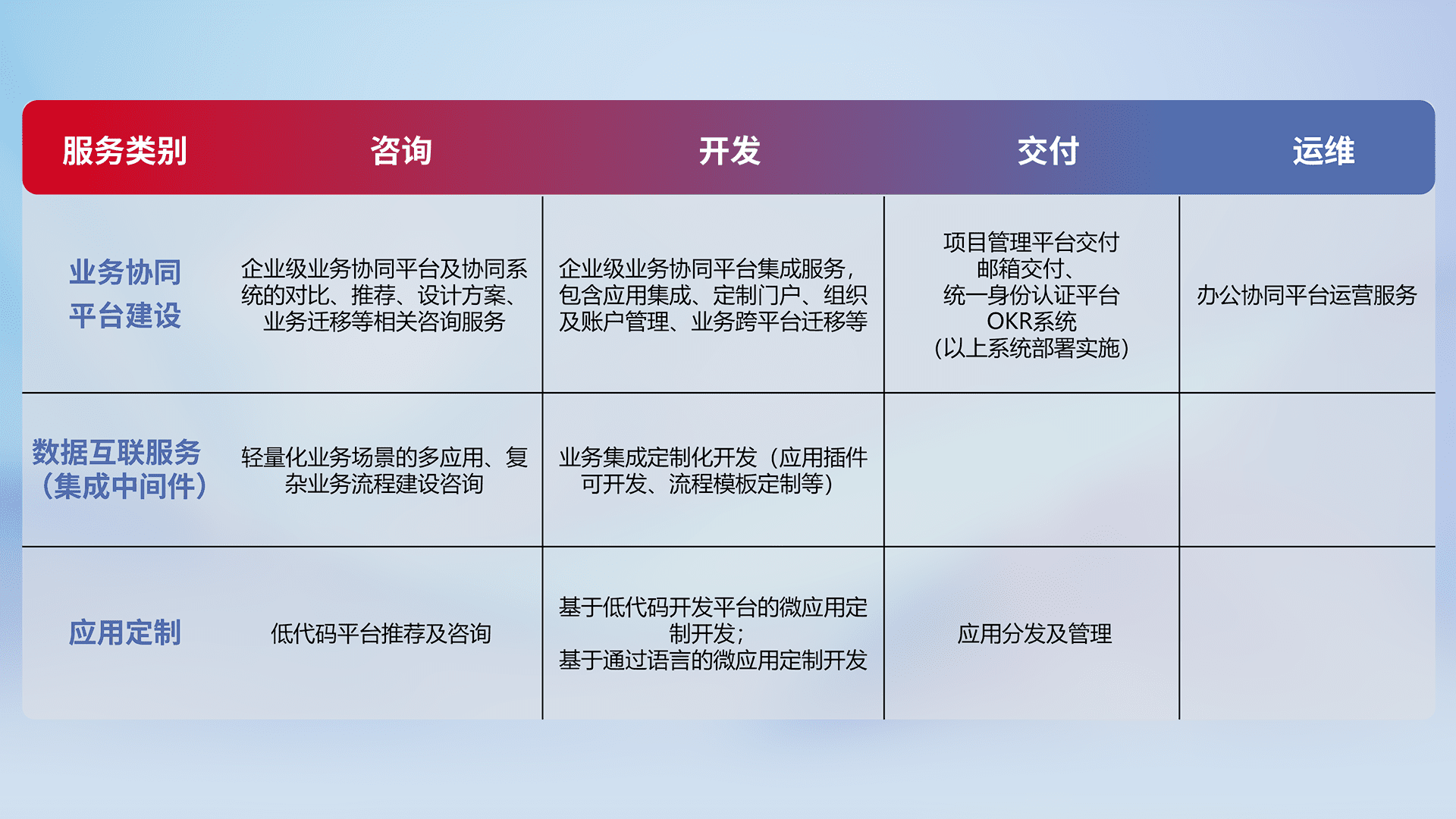 针对钉钉、、企微、、、IDaas等平台级产品提供产品的规划、、、方案、、、交付、、、定制化开发等服务,,,,实现如统一协同办公、、智能客户服务、、、、混合会议管理、、智能数据查询、、等业务场景,,实现数字化转型。。。。
